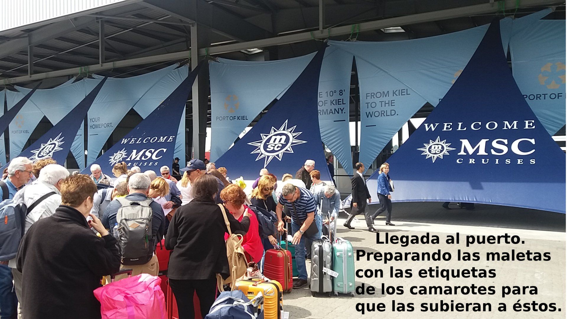 Día 1.- A las 5.30, el autobús que nos traslada al aeropuerto recoge al primer grupo de los 42 participantes en el viaje en el Sector III y sin ningún tipo de incidencias se van incorporando los compañeros recogidos en Getafe Central y Juan de la Cierva. En el camino al aeropuerto, Sol, la guía que nos acompañará durante todo el viaje, procede a distribuir las tarjetas de embarque y surge el primer 'contratiempo' al no coincidir en asientos contiguos las parejas que viajan. Asumida esta primera sorpresa, llegamos al aeropuerto, realizados los trámites de facturación, partimos hacia Hamburgo aterrizando sin incidencias según el horario previsto y una vez recogido el equipaje subimos al autobús que nos trasladaría a Kiel para realizar el embarque en nuestro crucero Miraviglia. Esta primera tarde la dedicamos a familiarizarnos con la ciudad flotante hasta la hora de la cena donde nos asignaron las mesas que ocuparíamos todo el grupo durante el viaje.
